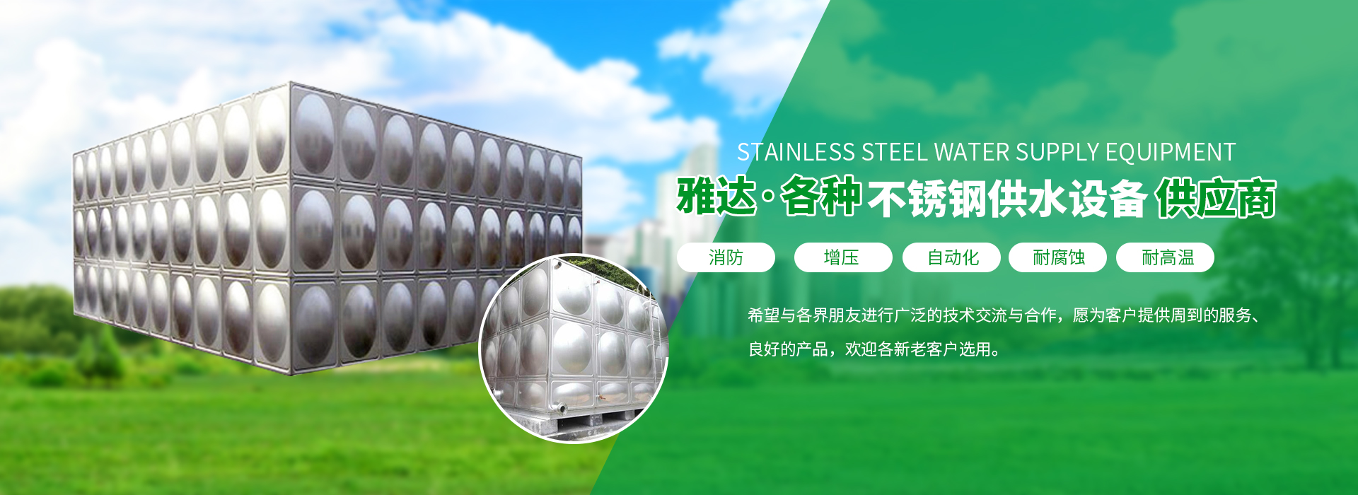我公司擁有十多種產品,主要包括:不銹鋼水箱、大模塊裝配式水箱、智慧標準泵房、生活供水設備、消防箱泵一體化設備、消防穩壓設備、不銹鋼隔油池、污水提升預制泵站、水箱消毒器、氣壓罐等。
